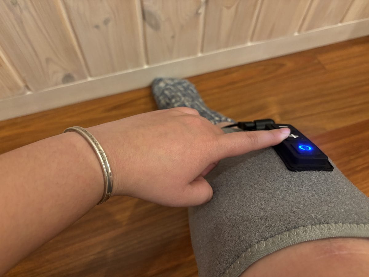 電源ケーブルを繋げて、ふくらはぎに巻くだけでセット完了。面ファスナー仕様なので、簡単に取り付けることができました。内側には取付位置の目安タグも付けられているので、やっぱり説明書要らず。後は電源ボタンを押せばOK!エアバックが膨らんで、ふくらはぎをいい感じに締め付けてくれます。