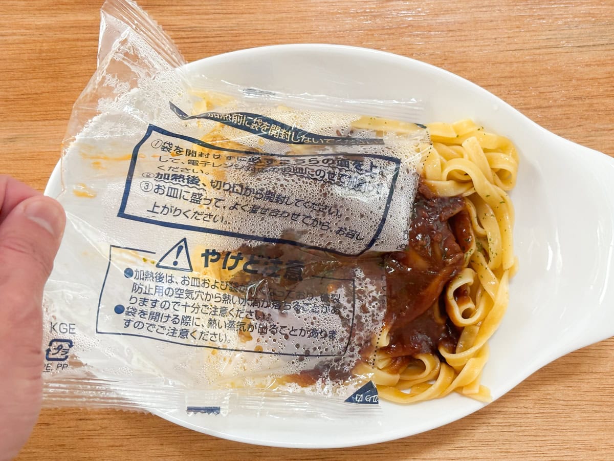 1品目は「超もち生パスタ 濃厚ボロネーゼデミグラスソース仕立て」で税込購入価格203円
