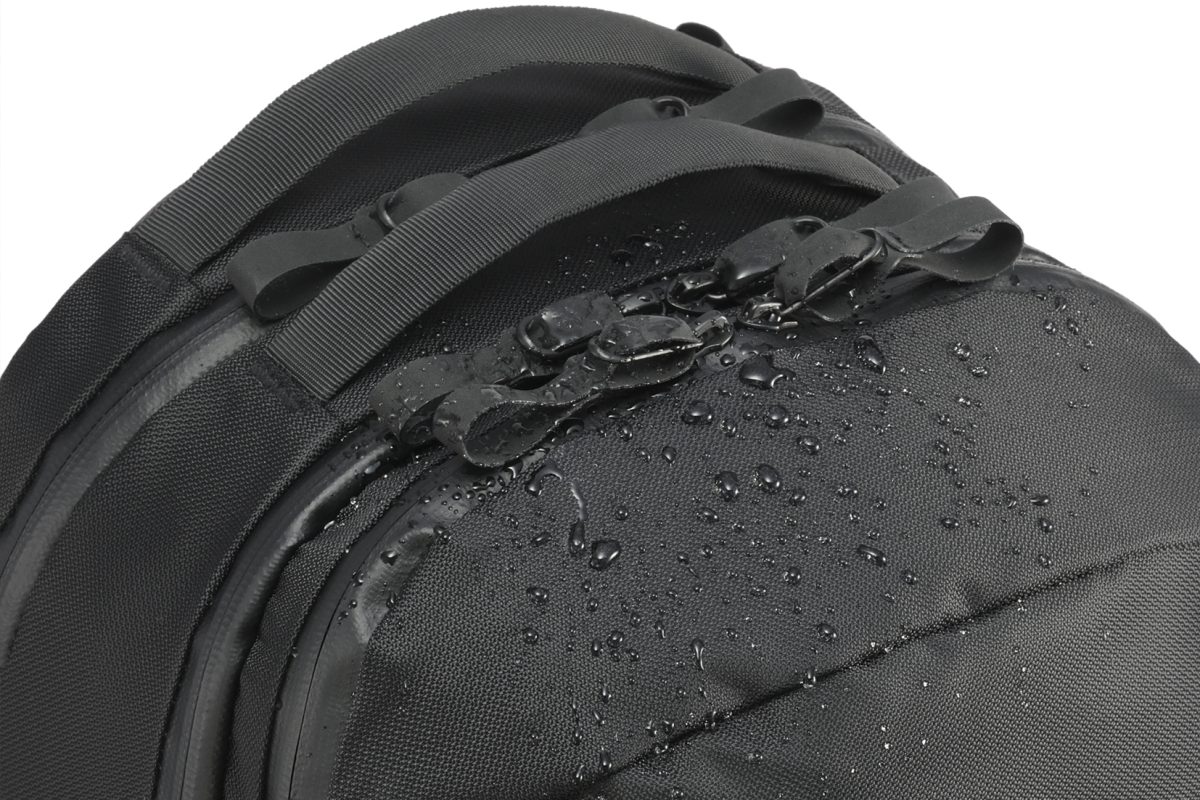雨具に匹敵する優れた耐水性(耐水圧10,000㎜ 以上)を持つタフな本体生地と、水が浸入しにくいコーティングファスナーを採用している。