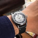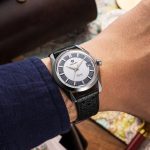 縦方向のブラッシュ仕上げを施したシルバーダイヤルは、氷河の柔らかな光を思わせる静謐な表情を演出。外周に配したアンスラサイトカラーのリングが上品なコントラストを生み、視認性と奥行きを向上。この2トーンの構成は“タキシードダイヤル”として知られ、クラシックな洗練を象徴する意匠だ。