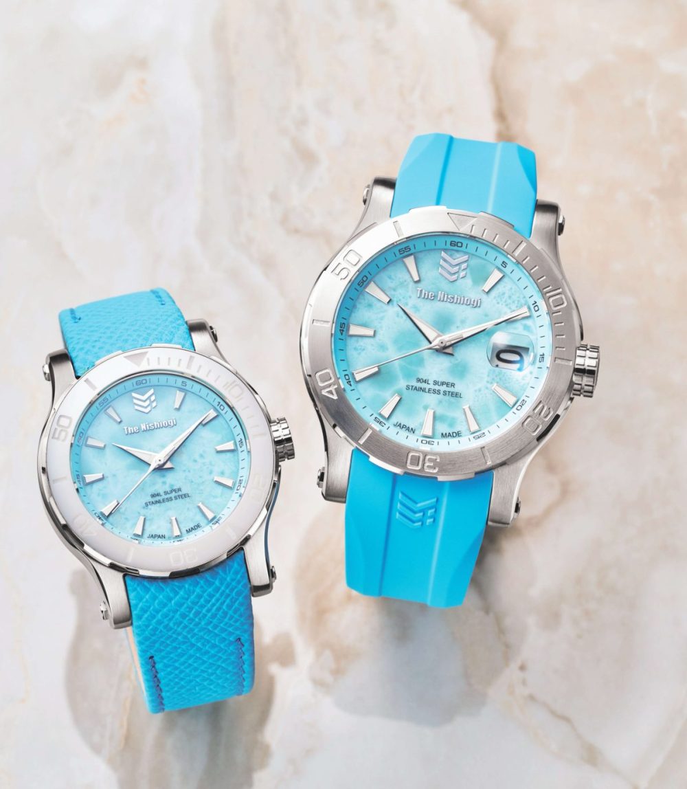 注目すべきは、文字盤に使われた天然石「ラリマー」。自然が生み出した波のような模様は、二つとして同じものが存在しません。高級ステンレス「904L」の輝きと、天然石の神秘的なブルーが融合した、ザ・ニシオギの意欲作をチェックしていきましょう。