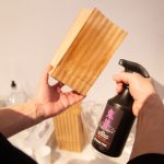 すかさず「鬼蓮Onibasu」を手に取り、実際に試してみました。紙袋にスプレーしてみると、液体が紙に浸透しているのか、それとも揮発しているのかわからないほど、瞬間的に乾いていくのが確認できました。そして、その紙袋を水の入った容器に入れてみると、完全に水を弾いているのです。水が漏れることなく、紙袋で水を汲むことができるほどの撥水力を発揮。改めて製品説明を聞いてみるとその超耐久力に驚かされました。