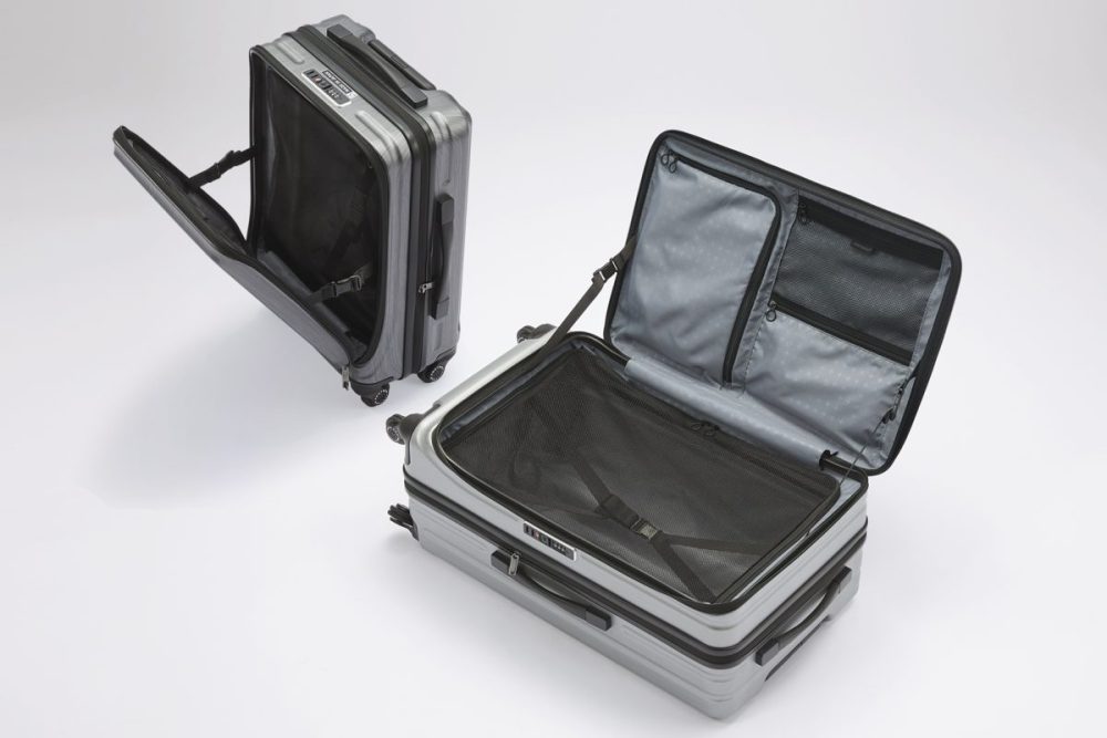 飛行機の座席数100席未満の機内持ち込みサイズに対応したスーツケース。高さを抑えた設計なので、新幹線の座席足下にも収まりやすく、上部にビジネスバッグを安定してセットアップできる。小型ロッカーにも収納可能。
